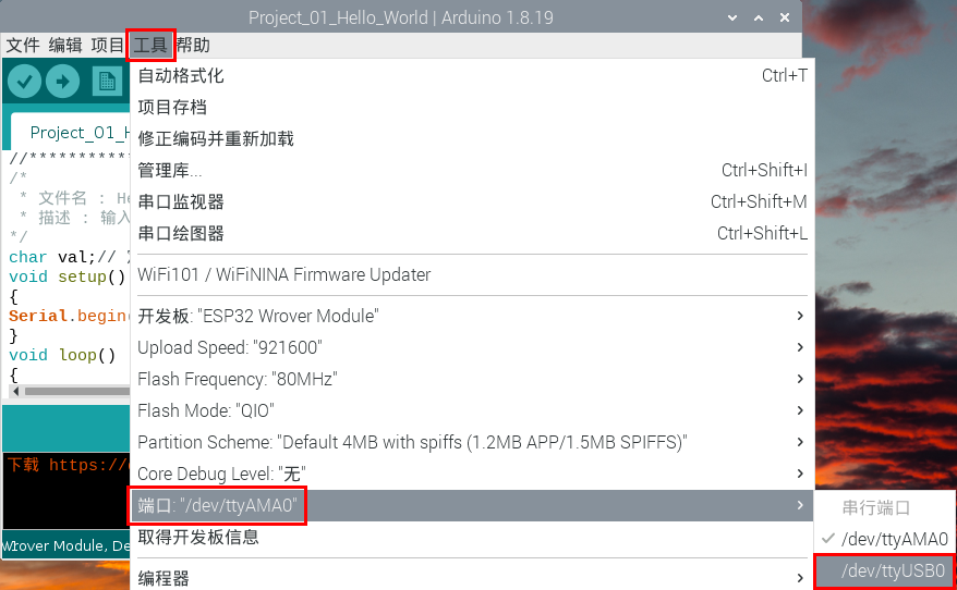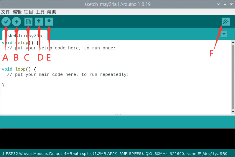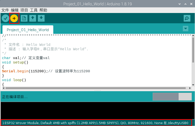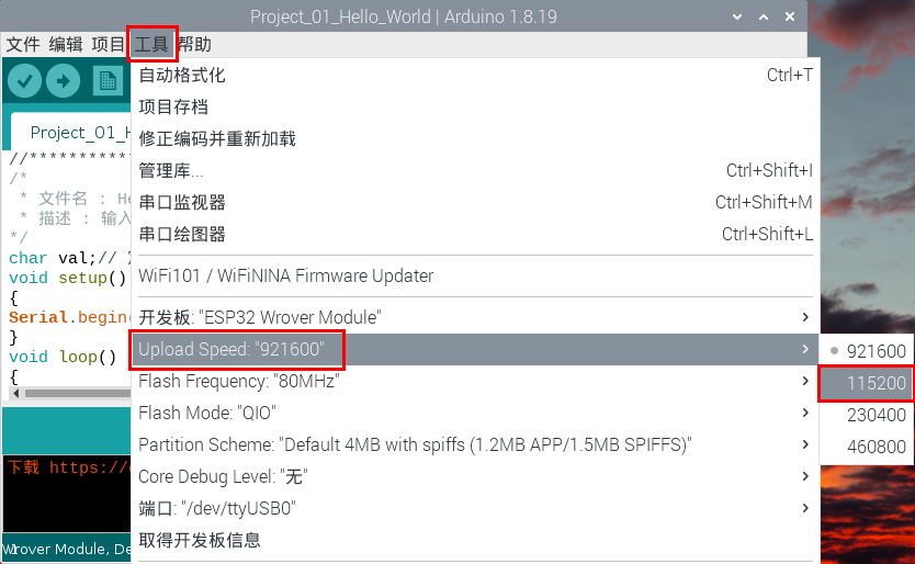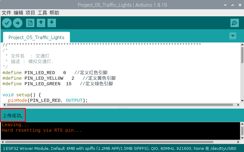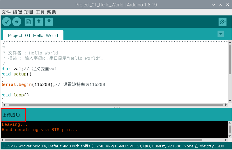 确认程序代码修改正确后,编译并上传代码到 ESP32主板上,上传成功后,打开串口监视器,设置波特率为115200。然后串口监视器窗口将显示如下:(如果打开串口监视器且设置波特率为115200之后,串口监视器窗口没有显示如下信息,可以按下ESP32的RESET键