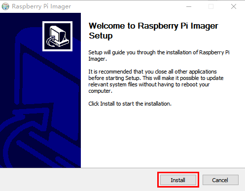 (2)(鼠标右键单击“imager_1.7.4.exe”文件,选择“以管理员身份运行”该文件。点击“Install”安装树莓派镜像imager。