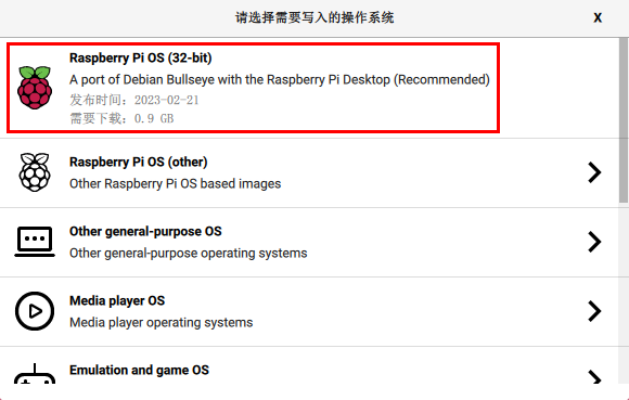 (3)打开imager工具。选择“Raspberry Pi OS(32-bit)”。