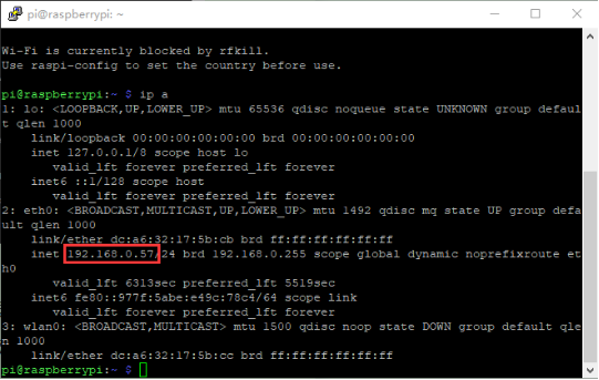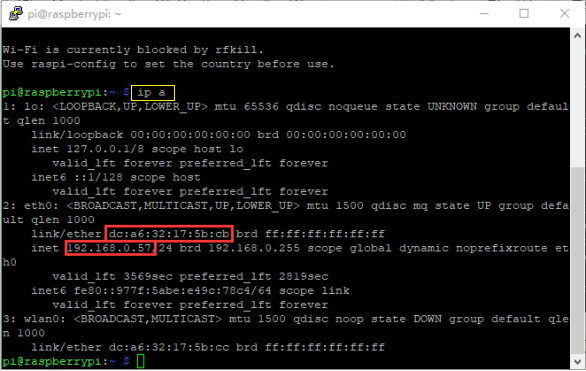 设置完成后,记录下树莓派的IP地址和MAC地址。根据下图红框所示,树莓派的MAC地址为:dc:a6:32:17:5b:cb,ip地址为:192.168.0.57。记录下你的树莓派的地址,后面使用WinSCP远程登录树莓派和使用xrdp远程登录树莓派系统桌面时都会使用到ip地址。