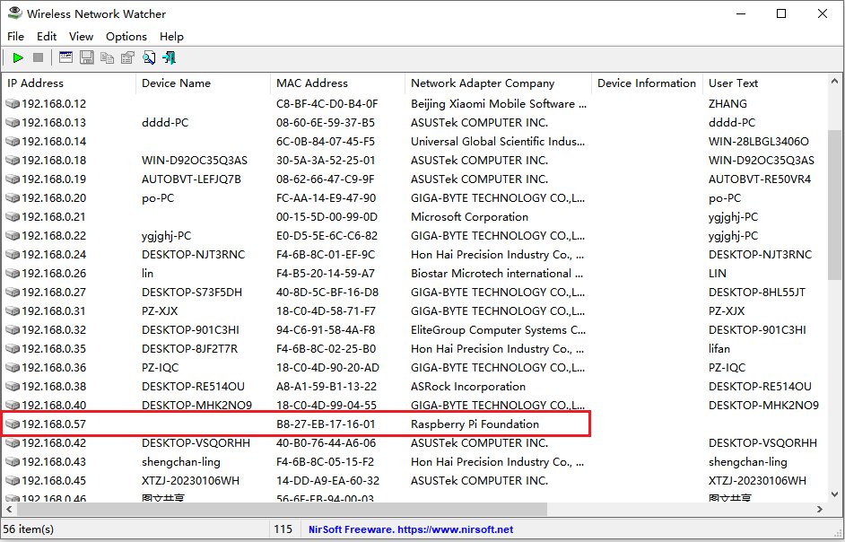 ② 使用WNetWatcher软件查找树莓派的IP地址。